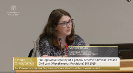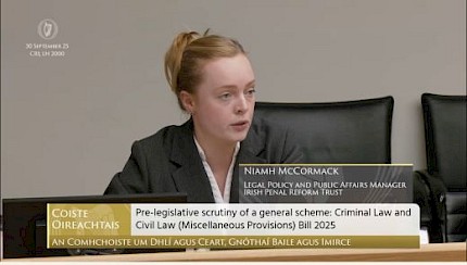 On 30 September 2025, the Joint Committee on Justice, Home Affairs and Migration met to examine the General Scheme of the Criminal Law and Civil Law (Miscellaneous Provisions) Bill 2025. IPRT's Executive Director, Saoirse Brady and Legal Policy and Public Affairs Manager, Niamh McCormack took part, providing evidence on key aspects of the Bill.